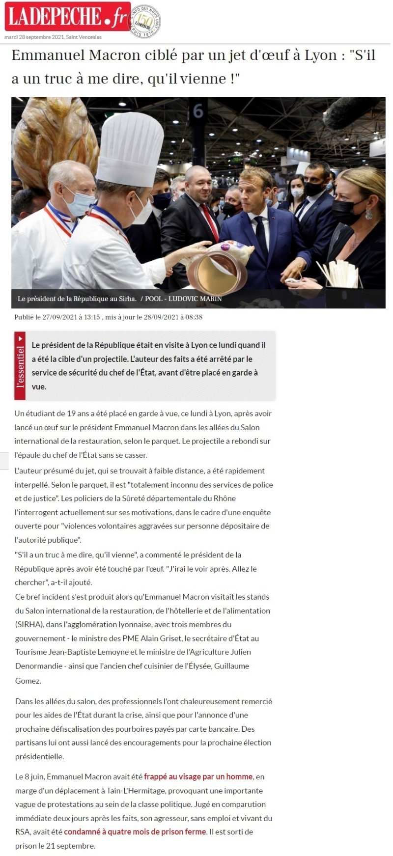 Jet d'oeuf ??? lors de son déplacement à Lyon le lundi 27 septembre 2021.